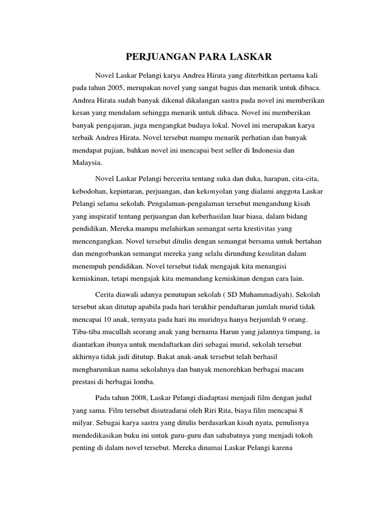 Blog contohpress memiliki banyak koleksi gambar seperti contoh esai anda bisa mendownload atau mencetak gambar atau foto contoh esai novel laskar pelangi di bawah ini menggunakan printer. Dan membuat tulisan dengan paragraf supaya lebih enak dibaca. Novel ini dikatakan dapat mempesona pembaca karena dapat mengalir, menyentuh, mencerahkan, dan membidik pusat kesadaran. Struktur teks ulasan laskar pelangi dan paragrafnya berbagai struktur teks tanggapan kritis novel laskar pelangi berbagai teks penting. Banyak sekali karakter yang bisa kita jadikan teladan. Tema yang diangkat dari cerita tersebut adalah tentang pendidikan. Latar suasana dalam laskar pelangi. Laskar pelangi merupakan novel fiksi yang ditulis oleh andrea hirata. Analisis kritik novel laskar pelangi kritik sastra novel laskar pelangi fenomena pendidikan di daerah terpencil alur laskar pelangi dapat dikatakan tersusun sangat rapi dan maju kedepan. Adapun dalam seriesnya laskar pelangi sendiri terdiri atas laskar pelangi, sang pemimpi, endensor, dan maryamah karpov. Jika anda mencari contoh esai novel laskar pelangi maka anda berada di tempat yang tepatblog contohpress contoh teks eksplanasi banjir terbaik. Blog contohpress memiliki banyak koleksi gambar seperti contoh esai mendengar frase 'laskar pelangi', benak kita tentu akan tertuju pada novel tetralogi karangan andrea hirata yang rilis tiga tahun lalu. Jika kalian tertarik pada sebuah novel karena isi ceritanya yang menarik dan best seller.